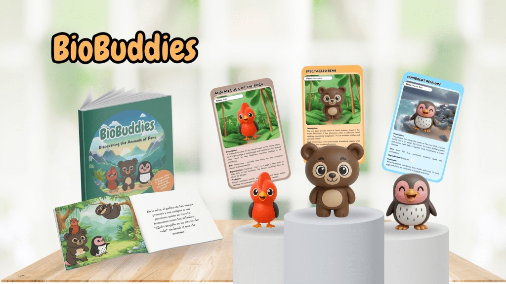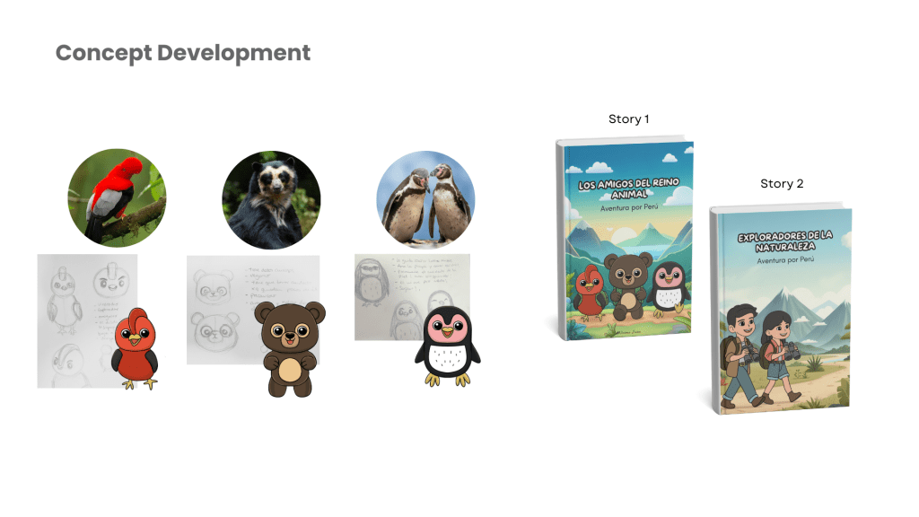 I sketched concepts and developed a storyline where animals guide children through different biomes. I chose three Peruvian species—Cock-of-the-rock (jungle), Spectacled Bear (highlands), Humboldt Penguin (coast)—to represent biodiversity.