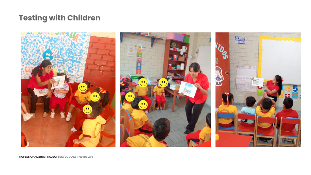 I organized tests in Peruvian schools with kids aged 3–7. Using two storybook versions, I observed how children responded to human vs. animal protagonists.
