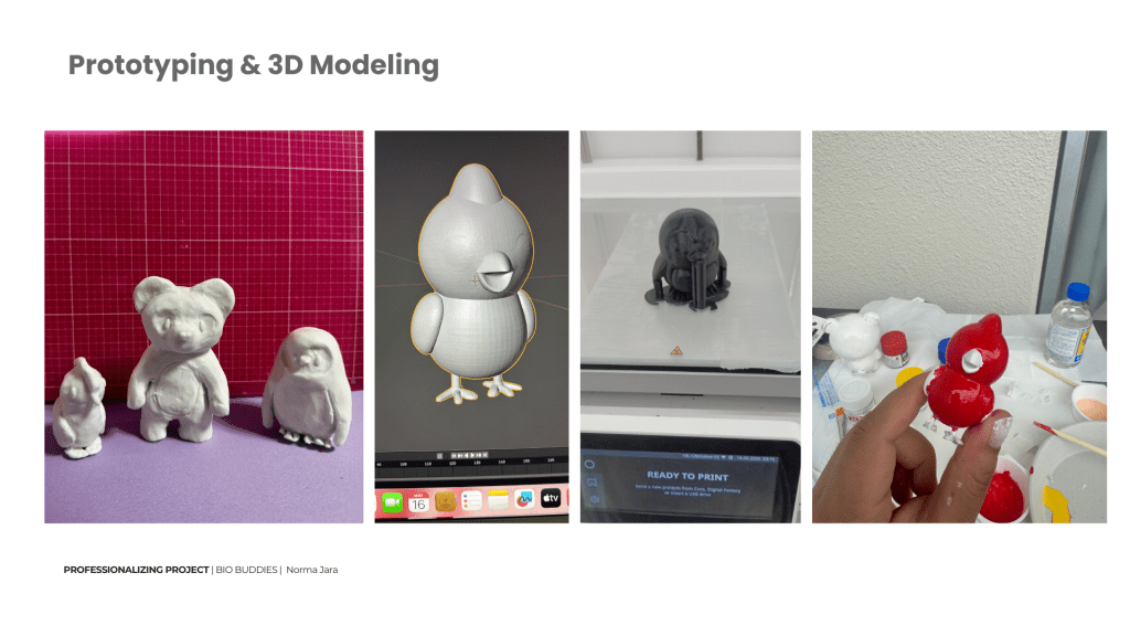 I modeled the characters in 3D and produced prototypes using PLA 3D printing. These were tested for ergonomics (easy to hold, solid) and emotional appeal.